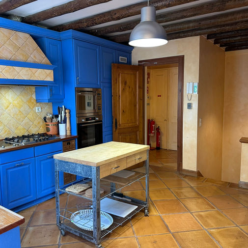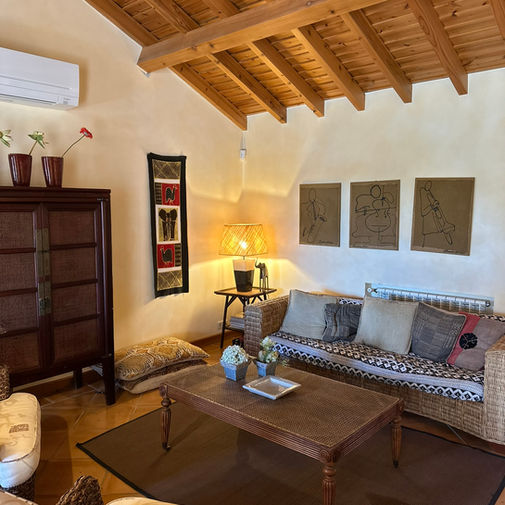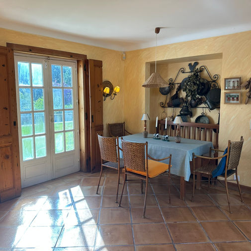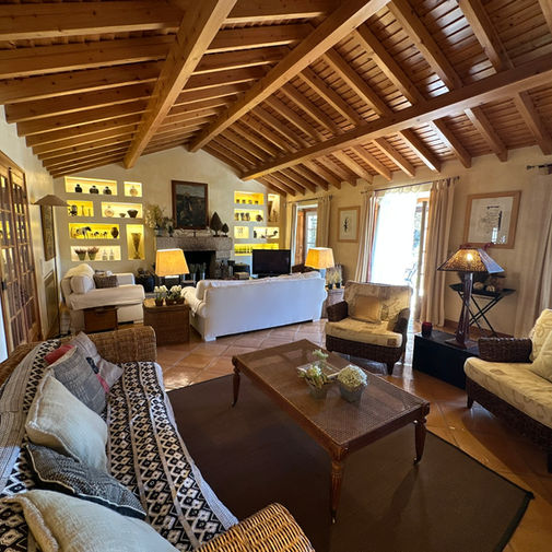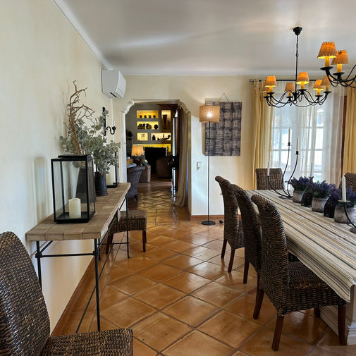 The cosy living room flows onto the lush gardens via large french doors, which open onto a relaxed lounging area under a porch, boasting views of the beautiful countryside with the sea in the distance. This is the ideal setting for a night cap or al fresco meals, admiring the beautiful panorama. Next to the living room, is a formal dining room and the fully equipped kitchen, which has a separate breakfast area, and a guest toilet room.